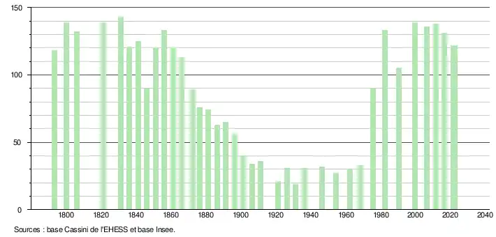 L'évolution du nombre d'habitants est connue à travers les recensements de la population effectués dans la commune depuis 1793. Pour les communes de moins de 10 000 habitants, une enquête de recensement portant sur toute la population est réalisée tous les cinq ans, les populations de référence des années intermédiaires étant quant à elles estimées par interpolation ou extrapolation[22]. Pour la commune, le premier recensement exhaustif entrant dans le cadre du nouveau dispositif a été réalisé en 2006[23].