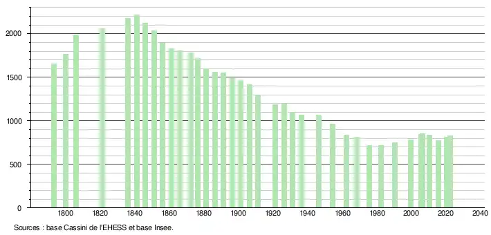 L'évolution du nombre d'habitants est connue à travers les recensements de la population effectués dans la commune depuis 1793. Pour les communes de moins de 10 000 habitants, une enquête de recensement portant sur toute la population est réalisée tous les cinq ans, les populations de référence des années intermédiaires étant quant à elles estimées par interpolation ou extrapolation[29]. Pour la commune, le premier recensement exhaustif entrant dans le cadre du nouveau dispositif a été réalisé en 2005[30].