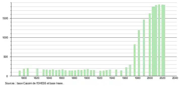 L'évolution du nombre d'habitants est connue à travers les recensements de la population effectués dans la commune depuis 1793. Pour les communes de moins de 10 000 habitants, une enquête de recensement portant sur toute la population est réalisée tous les cinq ans, les populations de référence des années intermédiaires étant quant à elles estimées par interpolation ou extrapolation[26]. Pour la commune, le premier recensement exhaustif entrant dans le cadre du nouveau dispositif a été réalisé en 2004[27].