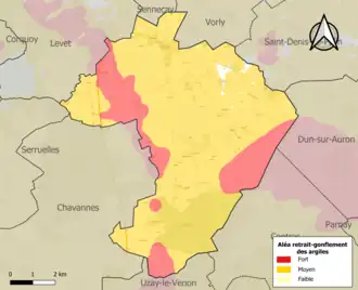 La commune est vulnérable au risque de mouvements de terrains constitué principalement du retrait-gonflement des sols argileux[14]. Cet aléa est susceptible d'engendrer des dommages importants aux bâtiments en cas d’alternance de périodes de sécheresse et de pluie. 99,2 % de la superficie communale est en aléa moyen ou fort (90 % au niveau départemental et 48,5 % au niveau national). Sur les 322 bâtiments dénombrés sur la commune en 2019, 322 sont en aléa moyen ou fort, soit 100 %, à comparer aux 83 % au niveau départemental et 54 % au niveau national. Une cartographie de l'exposition du territoire national au retrait gonflement des sols argileux est disponible sur le site du BRGM[15],[Carte 2].