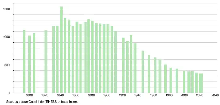 L'évolution du nombre d'habitants est connue à travers les recensements de la population effectués dans la commune depuis 1793. Pour les communes de moins de 10 000 habitants, une enquête de recensement portant sur toute la population est réalisée tous les cinq ans, les populations de référence des années intermédiaires étant quant à elles estimées par interpolation ou extrapolation[19]. Pour la commune, le premier recensement exhaustif entrant dans le cadre du nouveau dispositif a été réalisé en 2005[20].