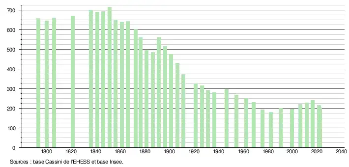 L'évolution du nombre d'habitants est connue à travers les recensements de la population effectués dans la commune depuis 1793. Pour les communes de moins de 10 000 habitants, une enquête de recensement portant sur toute la population est réalisée tous les cinq ans, les populations de référence des années intermédiaires étant quant à elles estimées par interpolation ou extrapolation[19]. Pour la commune, le premier recensement exhaustif entrant dans le cadre du nouveau dispositif a été réalisé en 2006[20].