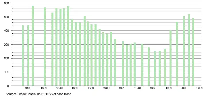 - ↑ Par convention dans Wikipédia, le principe a été retenu de n’afficher dans le tableau des recensements et le graphique, pour les populations légales postérieures à 1999, que les populations correspondant à une enquête exhaustive de recensement pour les communes de moins de 10 000 habitants, et que les populations des années 2006, 2011, 2016, etc. pour les communes de plus de 10 000 habitants, ainsi que la dernière population légale publiée par l’Insee pour l'ensemble des communes.