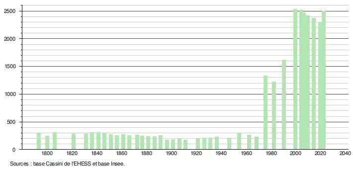 L'évolution du nombre d'habitants est connue à travers les recensements de la population effectués dans la commune depuis 1793. Pour les communes de moins de 10 000 habitants, une enquête de recensement portant sur toute la population est réalisée tous les cinq ans, les populations de référence des années intermédiaires étant quant à elles estimées par interpolation ou extrapolation[24]. Pour la commune, le premier recensement exhaustif entrant dans le cadre du nouveau dispositif a été réalisé en 2004[25].