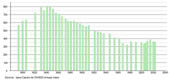 L'évolution du nombre d'habitants est connue à travers les recensements de la population effectués dans la commune depuis 1793. Pour les communes de moins de 10 000 habitants, une enquête de recensement portant sur toute la population est réalisée tous les cinq ans, les populations de référence des années intermédiaires étant quant à elles estimées par interpolation ou extrapolation[28]. Pour la commune, le premier recensement exhaustif entrant dans le cadre du nouveau dispositif a été réalisé en 2004[29].