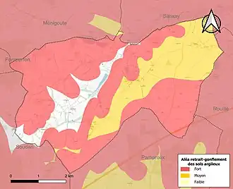 Les mouvements de terrains susceptibles de se produire sur la commune sont des tassements différentiels[15]. Le retrait-gonflement des sols argileux est susceptible d'engendrer des dommages importants aux bâtiments en cas d’alternance de périodes de sécheresse et de pluie[16]. 88,6 % de la superficie communale est en aléa moyen ou fort (54,9 % au niveau départemental et 48,5 % au niveau national)[Carte 2]. Depuis le , en application de la loi ELAN, différentes contraintes s'imposent aux vendeurs, maîtres d'ouvrages ou constructeurs de biens situés dans une zone classée en aléa moyen ou fort[Note 1],[17].