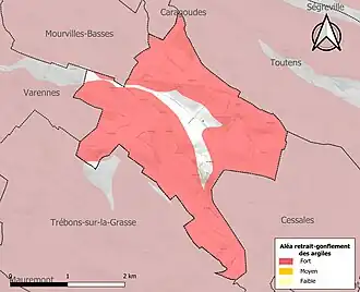Le retrait-gonflement des sols argileux est susceptible d'engendrer des dommages importants aux bâtiments en cas d’alternance de périodes de sécheresse et de pluie. 90,1 % de la superficie communale est en aléa moyen ou fort (88,8 % au niveau départemental et 48,5 % au niveau national). Sur les 44 bâtiments dénombrés sur la commune en 2019, 40 sont en aléa moyen ou fort, soit 91 %, à comparer aux 98 % au niveau départemental et 54 % au niveau national. Une cartographie de l'exposition du territoire national au retrait gonflement des sols argileux est disponible sur le site du BRGM[22],[Carte 3].