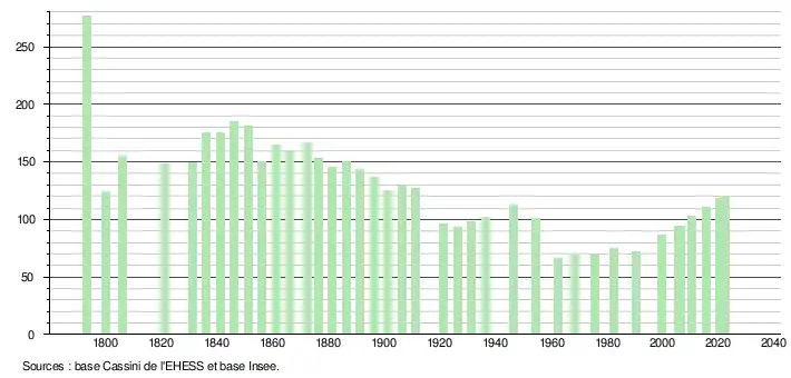 L'évolution du nombre d'habitants est connue à travers les recensements de la population effectués dans la commune depuis 1793. Pour les communes de moins de 10 000 habitants, une enquête de recensement portant sur toute la population est réalisée tous les cinq ans, les populations de référence des années intermédiaires étant quant à elles estimées par interpolation ou extrapolation[26]. Pour la commune, le premier recensement exhaustif entrant dans le cadre du nouveau dispositif a été réalisé en 2005[27].