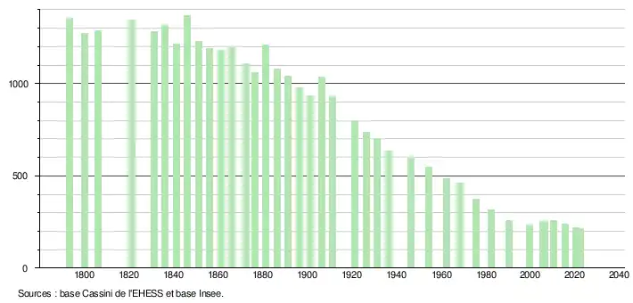 L'évolution du nombre d'habitants est connue à travers les recensements de la population effectués dans la commune depuis 1793. Pour les communes de moins de 10 000 habitants, une enquête de recensement portant sur toute la population est réalisée tous les cinq ans, les populations de référence des années intermédiaires étant quant à elles estimées par interpolation ou extrapolation[18]. Pour la commune, le premier recensement exhaustif entrant dans le cadre du nouveau dispositif a été réalisé en 2005[19].