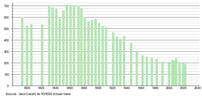 L'évolution du nombre d'habitants est connue à travers les recensements de la population effectués dans la commune depuis 1793. Pour les communes de moins de 10 000 habitants, une enquête de recensement portant sur toute la population est réalisée tous les cinq ans, les populations de référence des années intermédiaires étant quant à elles estimées par interpolation ou extrapolation[49]. Pour la commune, le premier recensement exhaustif entrant dans le cadre du nouveau dispositif a été réalisé en 2004[50].