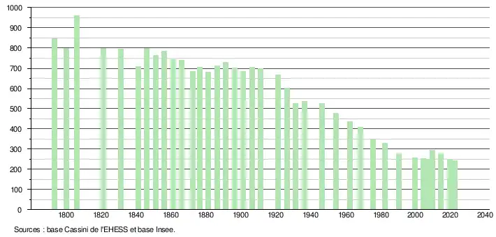 L'évolution du nombre d'habitants est connue à travers les recensements de la population effectués dans la commune depuis 1793. Pour les communes de moins de 10 000 habitants, une enquête de recensement portant sur toute la population est réalisée tous les cinq ans, les populations de référence des années intermédiaires étant quant à elles estimées par interpolation ou extrapolation[22]. Pour la commune, le premier recensement exhaustif entrant dans le cadre du nouveau dispositif a été réalisé en 2004[23].