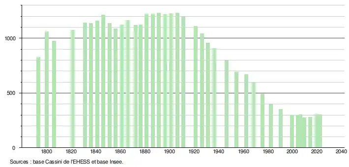 L'évolution du nombre d'habitants est connue à travers les recensements de la population effectués dans la commune depuis 1793. Pour les communes de moins de 10 000 habitants, une enquête de recensement portant sur toute la population est réalisée tous les cinq ans, les populations de référence des années intermédiaires étant quant à elles estimées par interpolation ou extrapolation[24]. Pour la commune, le premier recensement exhaustif entrant dans le cadre du nouveau dispositif a été réalisé en 2004[25].