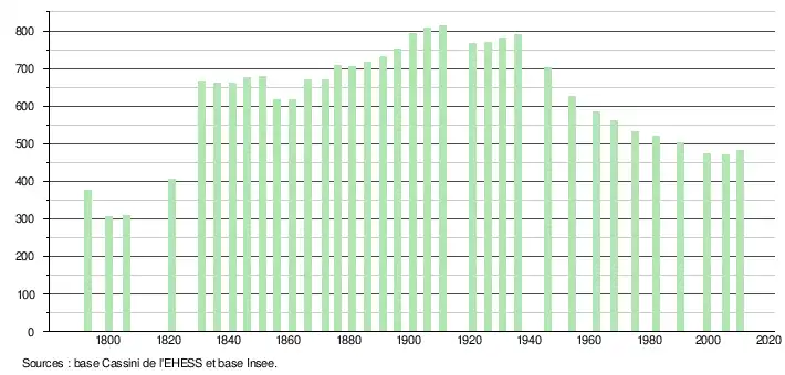 - ↑ Par convention dans Wikipédia, le principe a été retenu de n’afficher dans le tableau des recensements et le graphique, pour les populations légales postérieures à 1999, que les populations correspondant à une enquête exhaustive de recensement pour les communes de moins de 10 000 habitants, et que les populations des années 2006, 2011, 2016, etc. pour les communes de plus de 10 000 habitants, ainsi que la dernière population légale publiée par l’Insee pour l'ensemble des communes.