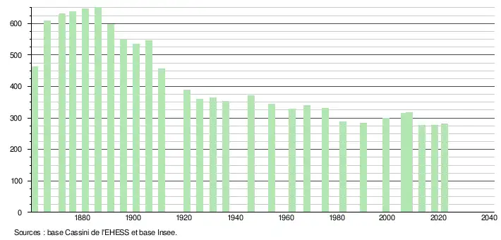 L'évolution du nombre d'habitants est connue à travers les recensements de la population effectués dans la commune depuis 1861. Pour les communes de moins de 10 000 habitants, une enquête de recensement portant sur toute la population est réalisée tous les cinq ans, les populations de référence des années intermédiaires étant quant à elles estimées par interpolation ou extrapolation[15]. Pour la commune, le premier recensement exhaustif entrant dans le cadre du nouveau dispositif a été réalisé en 2008[16].