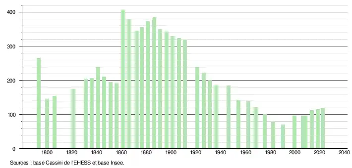 L'évolution du nombre d'habitants est connue à travers les recensements de la population effectués dans la commune depuis 1793. Pour les communes de moins de 10 000 habitants, une enquête de recensement portant sur toute la population est réalisée tous les cinq ans, les populations de référence des années intermédiaires étant quant à elles estimées par interpolation ou extrapolation[19]. Pour la commune, le premier recensement exhaustif entrant dans le cadre du nouveau dispositif a été réalisé en 2008[20].