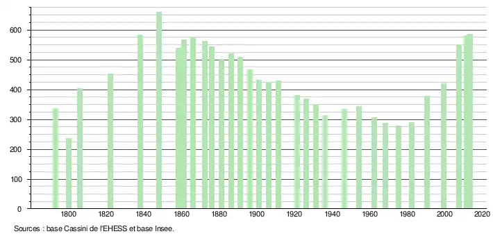 - ↑ Par convention dans Wikipédia, le principe a été retenu de n’afficher dans le tableau des recensements et le graphique, pour les populations légales postérieures à 1999, que les populations correspondant à une enquête exhaustive de recensement pour les communes de moins de 10 000 habitants, et que les populations des années 2006, 2011, 2016, etc. pour les communes de plus de 10 000 habitants, ainsi que la dernière population légale publiée par l’Insee pour l'ensemble des communes.