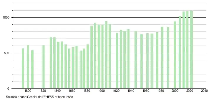 L'évolution du nombre d'habitants est connue à travers les recensements de la population effectués dans la commune depuis 1793. Pour les communes de moins de 10 000 habitants, une enquête de recensement portant sur toute la population est réalisée tous les cinq ans, les populations de référence des années intermédiaires étant quant à elles estimées par interpolation ou extrapolation[30]. Pour la commune, le premier recensement exhaustif entrant dans le cadre du nouveau dispositif a été réalisé en 2006[31].