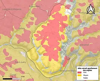 La commune est vulnérable au risque de mouvements de terrains constitué principalement du retrait-gonflement des sols argileux[22]. Cet aléa est susceptible d'engendrer des dommages importants aux bâtiments en cas d’alternance de périodes de sécheresse et de pluie. 86,2 % de la superficie communale est en aléa moyen ou fort (76,3 % au niveau départemental et 48,5 % au niveau national). Sur les 222 bâtiments dénombrés sur la commune en 2019, 218 sont en aléa moyen ou fort, soit 98 %, à comparer aux 90 % au niveau départemental et 54 % au niveau national. Une cartographie de l'exposition du territoire national au retrait gonflement des sols argileux est disponible sur le site du BRGM[23],[Carte 3].