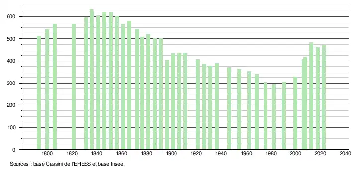 - ↑ Population municipale de référence en vigueur au 1er janvier 2025, millésimée 2022, définie dans les limites territoriales en vigueur au 1er janvier 2024, date de référence statistique : 1er janvier 2022.