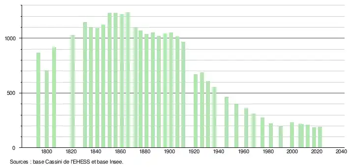 L'évolution du nombre d'habitants est connue à travers les recensements de la population effectués dans la commune depuis 1793. Pour les communes de moins de 10 000 habitants, une enquête de recensement portant sur toute la population est réalisée tous les cinq ans, les populations de référence des années intermédiaires étant quant à elles estimées par interpolation ou extrapolation[20]. Pour la commune, le premier recensement exhaustif entrant dans le cadre du nouveau dispositif a été réalisé en 2007[21].