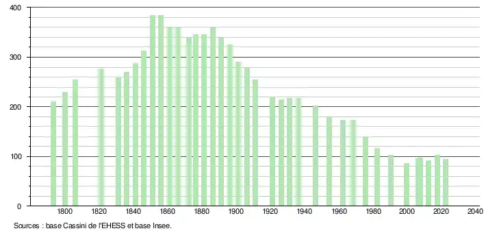 L'évolution du nombre d'habitants est connue à travers les recensements de la population effectués dans la commune depuis 1793. Pour les communes de moins de 10 000 habitants, une enquête de recensement portant sur toute la population est réalisée tous les cinq ans, les populations de référence des années intermédiaires étant quant à elles estimées par interpolation ou extrapolation[18]. Pour la commune, le premier recensement exhaustif entrant dans le cadre du nouveau dispositif a été réalisé en 2007[19].