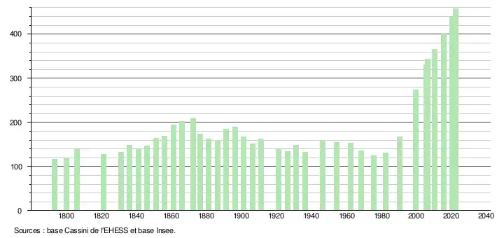 L'évolution du nombre d'habitants est connue à travers les recensements de la population effectués dans la commune depuis 1793. Pour les communes de moins de 10 000 habitants, une enquête de recensement portant sur toute la population est réalisée tous les cinq ans, les populations de référence des années intermédiaires étant quant à elles estimées par interpolation ou extrapolation[16]. Pour la commune, le premier recensement exhaustif entrant dans le cadre du nouveau dispositif a été réalisé en 2005[17].