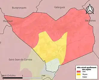 Le retrait-gonflement des sols argileux est susceptible d'engendrer des dommages importants aux bâtiments en cas d’alternance de périodes de sécheresse et de pluie. 95,5 % de la superficie communale est en aléa moyen ou fort (59,3 % au niveau départemental et 48,5 % au niveau national). Sur les 158 bâtiments dénombrés sur la commune en 2019, 158 sont en aléa moyen ou fort, soit 100 %, à comparer aux 85 % au niveau départemental et 54 % au niveau national. Une cartographie de l'exposition du territoire national au retrait gonflement des sols argileux est disponible sur le site du BRGM[13],[Carte 2].