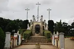 - Au centre de celui-ci, se trouve un calvaire et une petite réplique d'un chemin de croix. On y trouve des plaques portant les noms d’habitants massacrés pendant la guerre de Vendée. La balustrade du calvaire est surmontée par un chapelet du Rosaire donné au XIIIe siècle par la Vierge Marie à saint Dominique de Guzmán. Un des symboles rattachés à ce saint est l'étoile rouge que sa mère vit en songe sur son front accompagné d'un chien portant un flambeau dans la gueule.