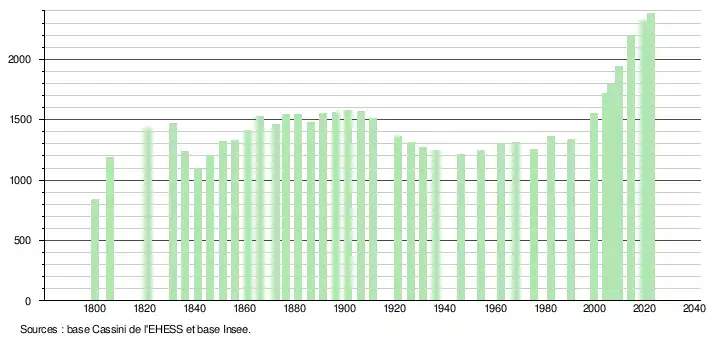 L'évolution du nombre d'habitants est connue à travers les recensements de la population effectués dans la commune depuis 1800. Pour les communes de moins de 10 000 habitants, une enquête de recensement portant sur toute la population est réalisée tous les cinq ans, les populations de référence des années intermédiaires étant quant à elles estimées par interpolation ou extrapolation[26]. Pour la commune, le premier recensement exhaustif entrant dans le cadre du nouveau dispositif a été réalisé en 2004[27].