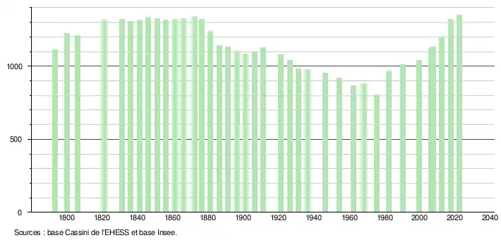 L'évolution du nombre d'habitants est connue à travers les recensements de la population effectués dans la commune depuis 1793. Pour les communes de moins de 10 000 habitants, une enquête de recensement portant sur toute la population est réalisée tous les cinq ans, les populations de référence des années intermédiaires étant quant à elles estimées par interpolation ou extrapolation[17]. Pour la commune, le premier recensement exhaustif entrant dans le cadre du nouveau dispositif a été réalisé en 2007[18].