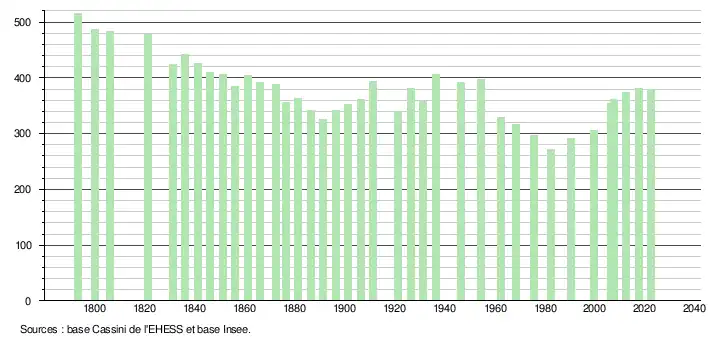 L'évolution du nombre d'habitants est connue à travers les recensements de la population effectués dans la commune depuis 1793. Pour les communes de moins de 10 000 habitants, une enquête de recensement portant sur toute la population est réalisée tous les cinq ans, les populations de référence des années intermédiaires étant quant à elles estimées par interpolation ou extrapolation[20]. Pour la commune, le premier recensement exhaustif entrant dans le cadre du nouveau dispositif a été réalisé en 2007[21].