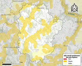 Le retrait-gonflement des sols argileux est susceptible d'engendrer des dommages importants aux bâtiments en cas d’alternance de périodes de sécheresse et de pluie. 39,3 % de la superficie communale est en aléa moyen ou fort (33,6 % au niveau départemental et 48,5 % au niveau national). Sur les 141 bâtiments dénombrés sur la commune en 2019, 39 sont en aléa moyen ou fort, soit 28 %, à comparer aux 25 % au niveau départemental et 54 % au niveau national. Une cartographie de l'exposition du territoire national au retrait gonflement des sols argileux est disponible sur le site du BRGM[13],[Carte 2].