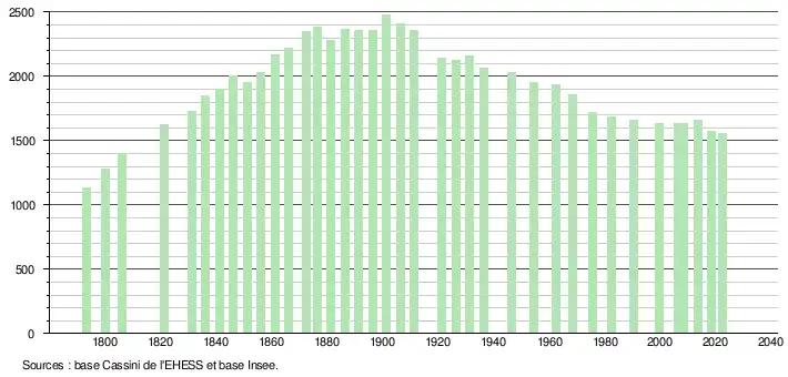 L'évolution du nombre d'habitants est connue à travers les recensements de la population effectués dans la commune depuis 1793. Pour les communes de moins de 10 000 habitants, une enquête de recensement portant sur toute la population est réalisée tous les cinq ans, les populations de référence des années intermédiaires étant quant à elles estimées par interpolation ou extrapolation[24]. Pour la commune, le premier recensement exhaustif entrant dans le cadre du nouveau dispositif a été réalisé en 2008[25].