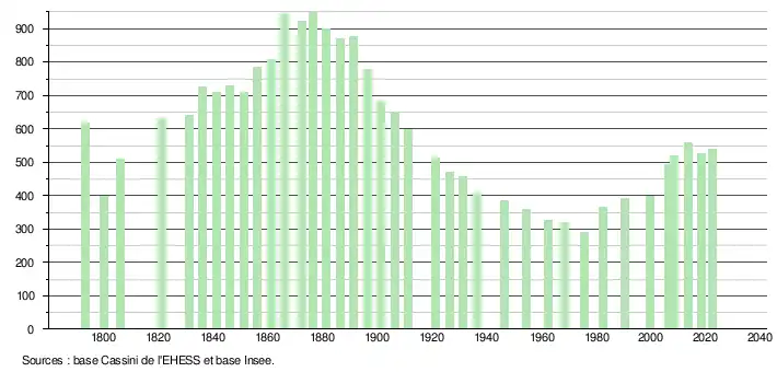 L'évolution du nombre d'habitants est connue à travers les recensements de la population effectués dans la commune depuis 1793. Pour les communes de moins de 10 000 habitants, une enquête de recensement portant sur toute la population est réalisée tous les cinq ans, les populations de référence des années intermédiaires étant quant à elles estimées par interpolation ou extrapolation[14]. Pour la commune, le premier recensement exhaustif entrant dans le cadre du nouveau dispositif a été réalisé en 2008[15].