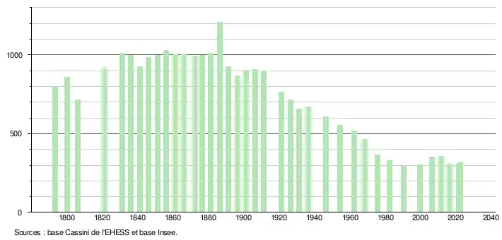 L'évolution du nombre d'habitants est connue à travers les recensements de la population effectués dans la commune depuis 1793. Pour les communes de moins de 10 000 habitants, une enquête de recensement portant sur toute la population est réalisée tous les cinq ans, les populations de référence des années intermédiaires étant quant à elles estimées par interpolation ou extrapolation[28]. Pour la commune, le premier recensement exhaustif entrant dans le cadre du nouveau dispositif a été réalisé en 2006[29].