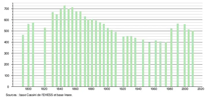 L'évolution du nombre d'habitants est connue à travers les recensements de la population effectués dans la commune depuis 1793. À partir du , les populations légales des communes sont publiées annuellement dans le cadre d'un recensement qui repose désormais sur une collecte d'information annuelle, concernant successivement tous les territoires communaux au cours d'une période de cinq ans. Pour les communes de moins de 10 000 habitants, une enquête de recensement portant sur toute la population est réalisée tous les cinq ans, les populations légales des années intermédiaires étant quant à elles estimées par interpolation ou extrapolation[4]. Pour la commune, le premier recensement exhaustif entrant dans le cadre du nouveau dispositif a été réalisé en 2004[5],[Note 1].