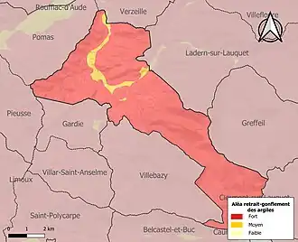 Le retrait-gonflement des sols argileux est susceptible d'engendrer des dommages importants aux bâtiments en cas d’alternance de périodes de sécheresse et de pluie. La totalité de la commune est en aléa moyen ou fort (75,2 % au niveau départemental et 48,5 % au niveau national). Sur les 433 bâtiments dénombrés sur la commune en 2019, 433 sont en aléa moyen ou fort, soit 100 %, à comparer aux 94 % au niveau départemental et 54 % au niveau national. Une cartographie de l'exposition du territoire national au retrait gonflement des sols argileux est disponible sur le site du BRGM[30],[Carte 3].