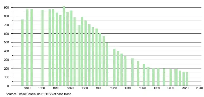 L'évolution du nombre d'habitants est connue à travers les recensements de la population effectués dans la commune depuis 1793. Pour les communes de moins de 10 000 habitants, une enquête de recensement portant sur toute la population est réalisée tous les cinq ans, les populations de référence des années intermédiaires étant quant à elles estimées par interpolation ou extrapolation[24]. Pour la commune, le premier recensement exhaustif entrant dans le cadre du nouveau dispositif a été réalisé en 2007[25].