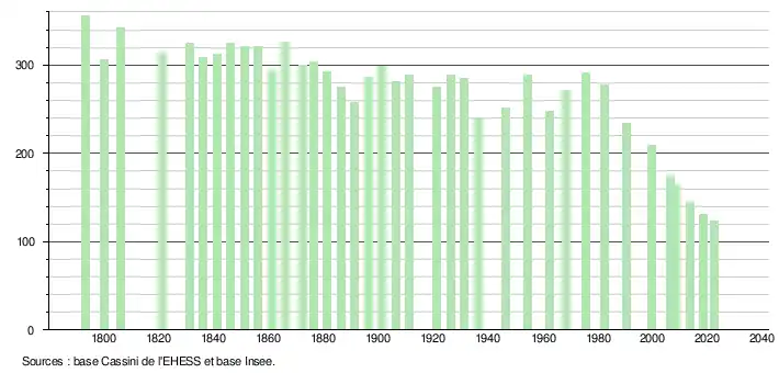 L'évolution du nombre d'habitants est connue à travers les recensements de la population effectués dans la commune depuis 1793. Pour les communes de moins de 10 000 habitants, une enquête de recensement portant sur toute la population est réalisée tous les cinq ans, les populations de référence des années intermédiaires étant quant à elles estimées par interpolation ou extrapolation[24]. Pour la commune, le premier recensement exhaustif entrant dans le cadre du nouveau dispositif a été réalisé en 2008[25].
