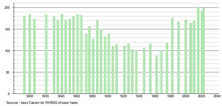 L'évolution du nombre d'habitants est connue à travers les recensements de la population effectués dans la commune depuis 1793. Pour les communes de moins de 10 000 habitants, une enquête de recensement portant sur toute la population est réalisée tous les cinq ans, les populations de référence des années intermédiaires étant quant à elles estimées par interpolation ou extrapolation[19]. Pour la commune, le premier recensement exhaustif entrant dans le cadre du nouveau dispositif a été réalisé en 2005[20].