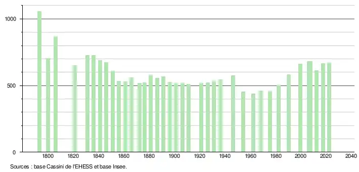 L'évolution du nombre d'habitants est connue à travers les recensements de la population effectués dans la commune depuis 1793. Pour les communes de moins de 10 000 habitants, une enquête de recensement portant sur toute la population est réalisée tous les cinq ans, les populations de référence des années intermédiaires étant quant à elles estimées par interpolation ou extrapolation[30]. Pour la commune, le premier recensement exhaustif entrant dans le cadre du nouveau dispositif a été réalisé en 2007[31].