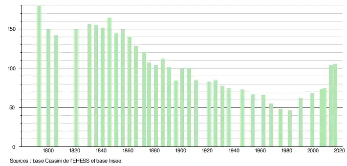 L'évolution du nombre d'habitants est connue à travers les recensements de la population effectués dans la commune depuis 1793. Pour les communes de moins de 10 000 habitants, une enquête de recensement portant sur toute la population est réalisée tous les cinq ans, les populations de référence des années intermédiaires étant quant à elles estimées par interpolation ou extrapolation[5]. Pour la commune, le premier recensement exhaustif entrant dans le cadre du nouveau dispositif a été réalisé en 2008[6].