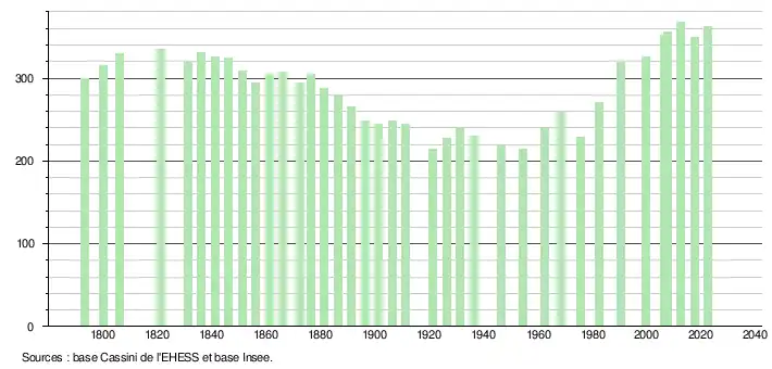 L'évolution du nombre d'habitants est connue à travers les recensements de la population effectués dans la commune depuis 1793. Pour les communes de moins de 10 000 habitants, une enquête de recensement portant sur toute la population est réalisée tous les cinq ans, les populations de référence des années intermédiaires étant quant à elles estimées par interpolation ou extrapolation[27]. Pour la commune, le premier recensement exhaustif entrant dans le cadre du nouveau dispositif a été réalisé en 2007[28].