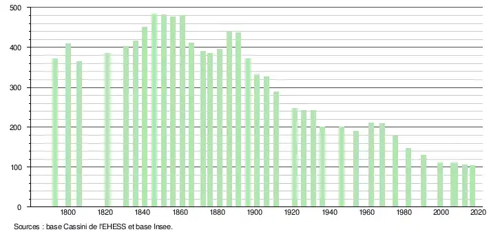 L'évolution du nombre d'habitants est connue à travers les recensements de la population effectués dans la commune depuis 1793. Pour les communes de moins de 10 000 habitants, une enquête de recensement portant sur toute la population est réalisée tous les cinq ans, les populations de référence des années intermédiaires étant quant à elles estimées par interpolation ou extrapolation[2]. Pour la commune, le premier recensement exhaustif entrant dans le cadre du nouveau dispositif a été réalisé en 2007[3].