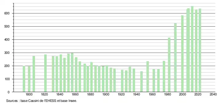L'évolution du nombre d'habitants est connue à travers les recensements de la population effectués dans la commune depuis 1793. Pour les communes de moins de 10 000 habitants, une enquête de recensement portant sur toute la population est réalisée tous les cinq ans, les populations de référence des années intermédiaires étant quant à elles estimées par interpolation ou extrapolation[40]. Pour la commune, le premier recensement exhaustif entrant dans le cadre du nouveau dispositif a été réalisé en 2007[41].