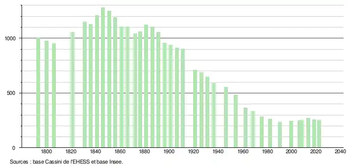 L'évolution du nombre d'habitants est connue à travers les recensements de la population effectués dans la commune depuis 1793. Pour les communes de moins de 10 000 habitants, une enquête de recensement portant sur toute la population est réalisée tous les cinq ans, les populations de référence des années intermédiaires étant quant à elles estimées par interpolation ou extrapolation[16]. Pour la commune, le premier recensement exhaustif entrant dans le cadre du nouveau dispositif a été réalisé en 2008[17].