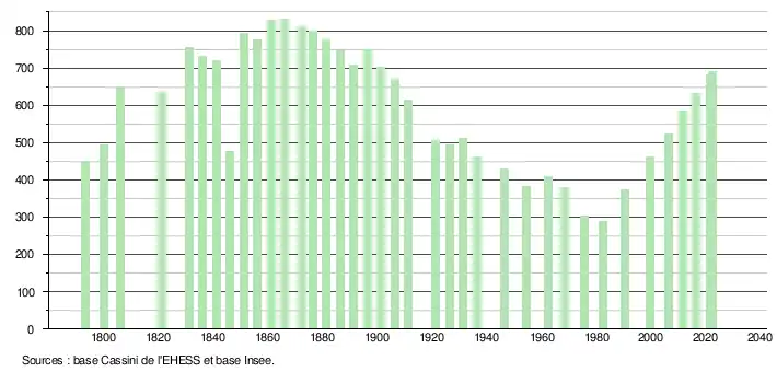 L'évolution du nombre d'habitants est connue à travers les recensements de la population effectués dans la commune depuis 1793. Pour les communes de moins de 10 000 habitants, une enquête de recensement portant sur toute la population est réalisée tous les cinq ans, les populations de référence des années intermédiaires étant quant à elles estimées par interpolation ou extrapolation[21]. Pour la commune, le premier recensement exhaustif entrant dans le cadre du nouveau dispositif a été réalisé en 2006[22].