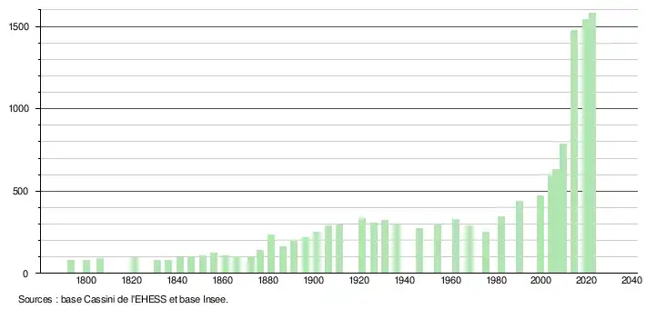 L'évolution du nombre d'habitants est connue à travers les recensements de la population effectués dans la commune depuis 1793. Pour les communes de moins de 10 000 habitants, une enquête de recensement portant sur toute la population est réalisée tous les cinq ans, les populations de référence des années intermédiaires étant quant à elles estimées par interpolation ou extrapolation[31]. Pour la commune, le premier recensement exhaustif entrant dans le cadre du nouveau dispositif a été réalisé en 2004[32].