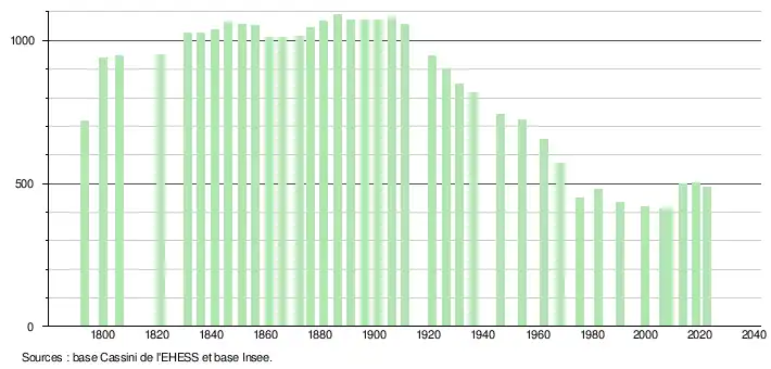 L'évolution du nombre d'habitants est connue à travers les recensements de la population effectués dans la commune depuis 1793. Pour les communes de moins de 10 000 habitants, une enquête de recensement portant sur toute la population est réalisée tous les cinq ans, les populations de référence des années intermédiaires étant quant à elles estimées par interpolation ou extrapolation[23]. Pour la commune, le premier recensement exhaustif entrant dans le cadre du nouveau dispositif a été réalisé en 2008[24].