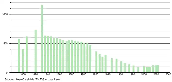 L'évolution du nombre d'habitants est connue à travers les recensements de la population effectués dans la commune depuis 1793. Pour les communes de moins de 10 000 habitants, une enquête de recensement portant sur toute la population est réalisée tous les cinq ans, les populations de référence des années intermédiaires étant quant à elles estimées par interpolation ou extrapolation[18]. Pour la commune, le premier recensement exhaustif entrant dans le cadre du nouveau dispositif a été réalisé en 2004[19].